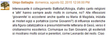 Pare che, a somiglianza di un fiume carsico, il Precursore abbia dato origine ad un’intrigante linea esoterica, la cosiddetta “tradizione giovannita”, sebbene la Chiesa nicena e post-nicena abbia agito per normalizzare questa figura. Tale corrente qua e là affiora, manifestandosi in opere criptiche, come i quadri di Leonardo da Vinci, il genio rinascimentale che fu anche un occultista. Lo stesso segno del Battista, l’indice diretto verso l’alto, potrebbe avere un significato non riferibile in modo banale alla trascendenza.Ecco ci ha messo dentro Leonardo da Vinci, Giovanni XXIII, la massoneria e gli ufo...Vediamo un paio di commenti: