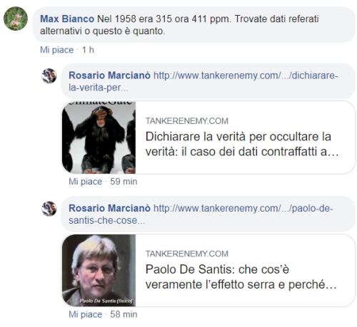 La CO2 per esempio, additata come il pericolo maggiore, non è un gas serra e quindi non si comprende perché mai la sua limitazione sia diventata il cavallo di battaglia di questi ambientalisti ciechi. Dietro tutto si aggira lo spettro della legalizzazione della geoingegneria, ossia il riconoscimento legalizzato delle scie chimiche e delle operazioni di irradiamento dell’atmosfera per ottenere uno strumento di controllo totale dell’ambiente.Che la CO2 non sia un gas serra è sostenuto dagli "scienziati" al soldo della lobby petrolio-carbone. Naturalmente il nostro vorrebbe una "sollevazione di massa", invece alle sue frottole crede solo un gruppetto di esaltati.